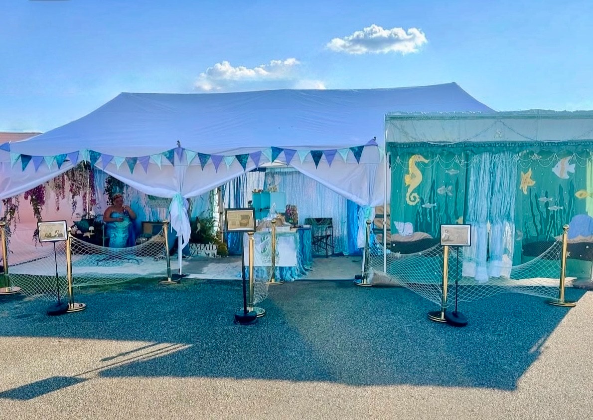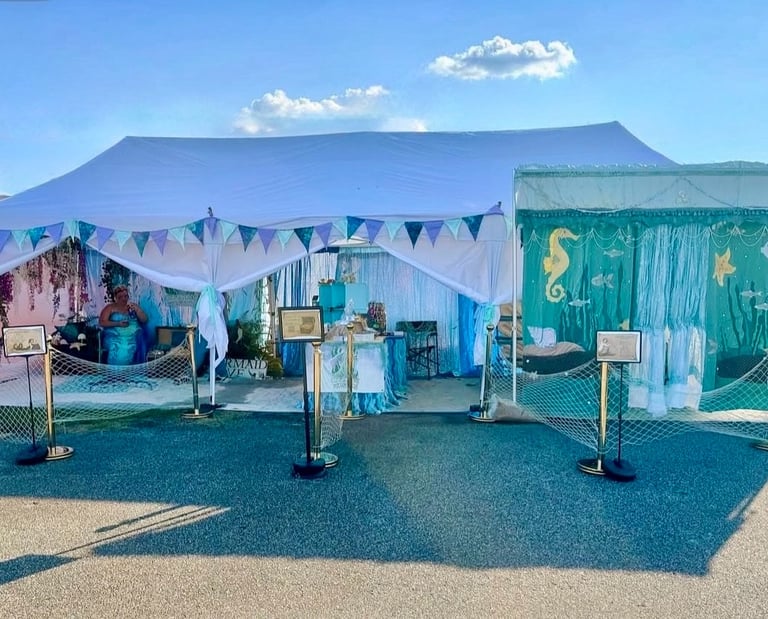 Our Land Mermaid Encounter brings waves of magic anywhere, no pool required! Perfect for festivals, renaissance faires, parties, and more. With just a 10x20 space, we can create a sparkling setup full of mermaid wonder.